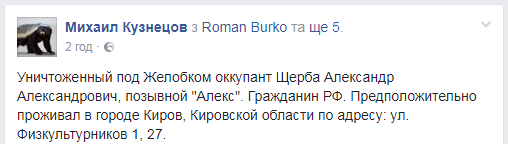 "Уничтоженный под Желобком оккупант Щерба Александр Александрович, позывной "Алекс". Гражданин РФ. Предположительно проживал в городе Киров, Кировской области по адресу: ул. Физкультурников 1, 27" , - написал он, отметив, что по этому адресу проживает мать погибшего.
