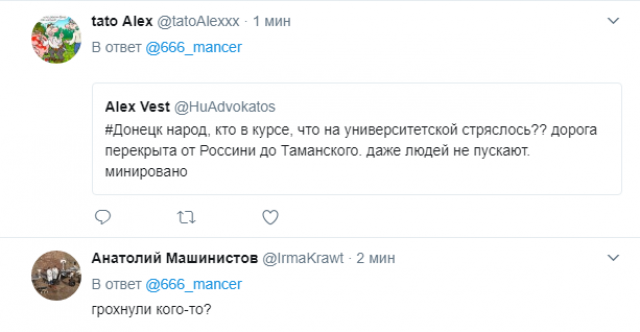 «Народ, кто в курсе, что на университетской стряслось? дорога перекрыта от Россини до Таманского. даже людей не пускают. минировано»