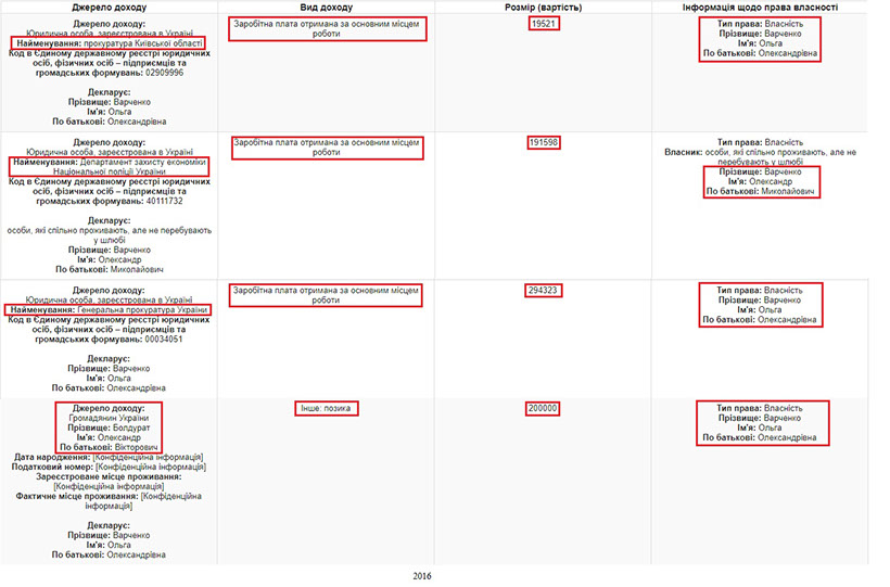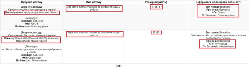 Щодо прибутків, то, проаналізувавши декларації пані Варченко за 2015 та 2016 роки, ми бачимо, що основним фінансовим джерелом Ольги Олександрівни та її чоловіка, який працює в Департаменті захисту економіки Національної поліції, є їхні заробітні плати. А в декларації за 2016 рік фігурує позика, отримана Ольгою Варченко від її батька в розмірі 200 тис.грн.
