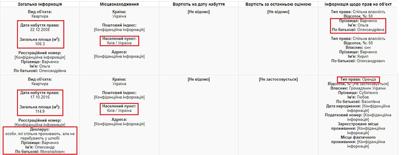Щодо майна, то Ольга Варченко має квартиру в Києві площею 106 кв.м.. Ще одну квартиру в столиці, площею 114 кв.м., згідно з декларацією, орендує її чоловік.