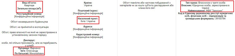 Ще одним «недобудованим» об’єктом володіє чоловік пані Варченко, а саме - квартирою в Житловому комплексі «Захисник» площею 66 кв.м. ЖБК «Захисник» є житловим кооперативом для працівників Національної поліції міста Києва. Членами кооперативу можуть бути працівники НП, які потребують поліпшення житлових умов та перебувають на квартирному обліку. З цього постає питання щодо участі в кооперативі Олександра Варченка, адже його родина має квартиру й завершує будівництво будинку в Києві.