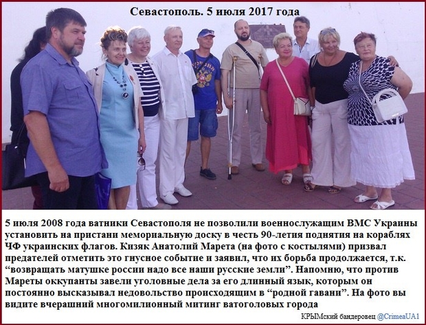 7. 5 июля 2008 года ватники Севастополя не позволили военнослужащим ВМС Украины установить на пристани мемориальную доску в честь 90-летия поднятия на кораблях ЧФ украинских флагов. Кизяк Анатолий Марета призвал предателей отметить это гнусное событие, заявив, что борьба продолжается, т.к. "возвращать матушке россии надо все наши русские земли". На вчерашний щабаш пришло аж 10 ватоголовых.