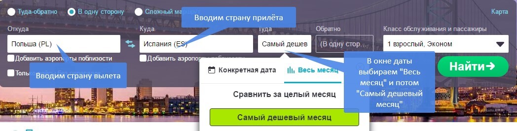 В окне даты выбираем «Весь месяц» и потом «Самый дешевый месяц». Это позволит увидеть самые лучшие цены за год.