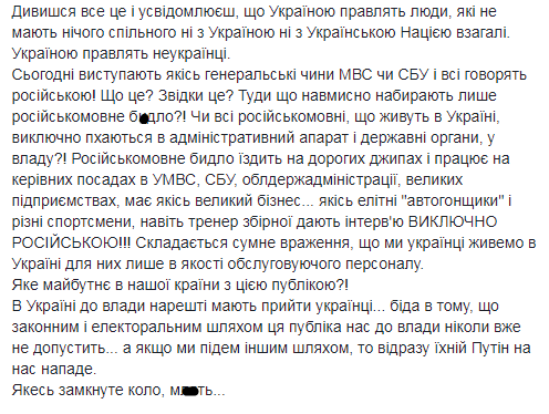 За його словами, в Україні "можновладцями найвищого ешелону є люди, які спілкуються між собою іноземною мовою сусідньої держави, з якою у нас вічна історична війна".
