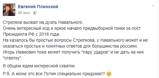 «Стрелков вызвал на дуэль Навального. Очень интересный ход и яркое начало предвыборной гонки за пост Президента РФ с 2018 года. На казалось бы простые вопросы Стрелкова, у Навального может и не оказаться простых и понятных ответов для большинства россиян. Игорь Иванович тоже может получить «пару ударов» и не дать на них «ответку». В общем, ждем интересной схватки. А может, это все Путин специально придумал?» — предполагает журналист Евгений Плинский.