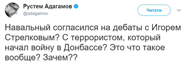 «Навальный согласился на дебаты с Игорем Стрелковым? С террористом, который начал войну в Донбассе? Это что такое вообще? Зачем??» — недоумевает российский блогер Рустем Адагамов.