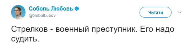 «Стрелков — военный преступник. Его надо судить», — пишет представитель возглавляемого Навальным Фонда борьбы с коррупцией Любовь Соболь.