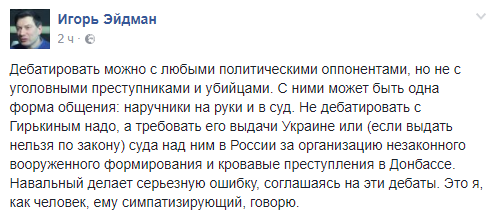 «Дебатировать можно с любыми политическими оппонентами, но не с уголовными преступниками и убийцами. С ними может быть одна форма общения: наручники на руки и в суд. Не дебатировать с Гиркиным надо, а требовать его выдачи Украине или (если выдать нельзя по закону) суда над ним в России за организацию незаконного вооруженного формирования и кровавые преступления на Донбассе. Навальный делает серьезную ошибку, соглашаясь на эти дебаты. Это я, как человек, ему симпатизирующий, говорю», — считает российский политолог Игорь Эйдман.