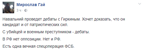 «Навальный проведет дебаты с Гиркиным. Хочет доказать, что он кандидат и от патриотических сил. С убийцей и военным преступником — дебаты. В РФ нет оппозиции. Нет и РФ. Есть одна вечная спецоперация ФСБ», — считает волонтер ВСУ Мирослав Гай.