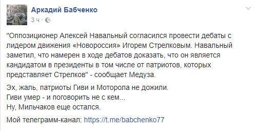 «Оппозиционер Алексей Навальный согласился провести дебаты с лидером движения «Новороссия» Игорем Стрелковым. Навальный заметил, что намерен в ходе дебатов доказать, что он является кандидатом в президенты в том числе от патриотов, которых представляет Стрелков» — сообщает Медуза. Эх, жаль, патриоты Гиви и Моторола не дожили. Гиви умер — и поговорить не с кем… Ну, Мильчаков еще остался», — пишет российский журналист Аркадий Бабченко.
