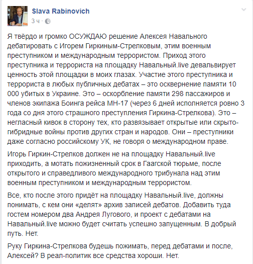 «Я твёрдо и громко ОСУЖДАЮ решение Алексея Навального дебатировать с Игорем Гиркиным-Стрелковым, этим военным преступником и международным террористом. Приход этого преступника и террориста на площадку Навальный.live девальвирует ценность этой площадки в моих глазах. Участие этого преступника и террориста в любых публичных дебатах – это осквернение памяти 10 000 убитых в Украине. Это – оскорбление памяти 298 пассажиров и членов экипажа Боинга рейса МН 17 (через 6 дней исполняется ровно 3 года со дня этого страшного преступления Гиркина-Стрелкова). Это – негласный кивок в сторону тех, кто развязывает открытые или скрыто-гибридные войны против других стран и народов. Они – преступники даже согласно российскому УК, не говоря о международном праве. Игорь Гиркин-Стрелков должен не на площадку Навальный.live приходить, а мотать пожизненный срок в Гаагской тюрьме, после открытого и справедливого международного трибунала над этим военным преступником и международным террористом… Руку Гиркина-Стрелкова будешь пожимать перед дебатами и после, Алексей? В реал-политик все средства хороши. Нет», — пишет российский финансист и блогер Слава Рабинович.