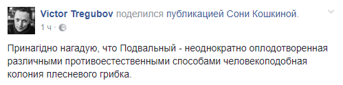 «Принагідно нагадую, что Подвальный — неоднократно оплодотворенная различными противоестественными способами человекоподобная колония плесневого грибка», — пишет журналист Виктор Трегубов.
