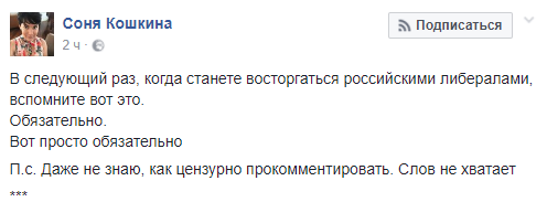 П.с. Даже не знаю, как цензурно прокомментировать. Слов не хватает», — возмущается журналистка Соня Кошкина.