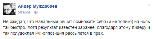 «Не ожидал, что Навальный решит помножить себя (и не только) на ноль так быстро. Хотя результат известен заранее: благодаря этому лидеру и так полудохлая РФ-оппозиция рассыпется в прах», — добавил Муждабаев.