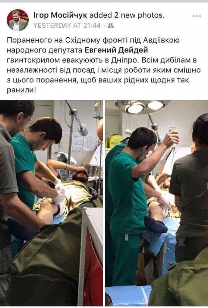 При этом депутат от Радикальной партии Игорь Мосийчук в своей заметке в Facebook утверждает, что Дейдей был ранен миной. В предыдущих сообщениях Мосийчук утверждал, что депутат был ранен в "промзоне" Авдеевки.