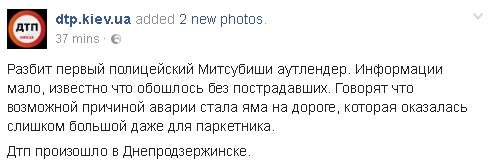 "Разбит первый полицейский Mitsubishi Outlander.Информации мало, известно что обошлось без пострадавших", - написано в сообщении.