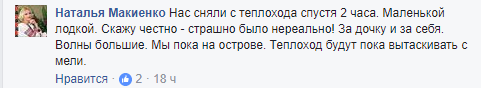 Позже Наталья Макиенко добавила, что их с дочкой сняли с теплохода спустя два часа маленькой лодкой и, как и других отдыхающих, доправили до острова, несмотря на большие волны.