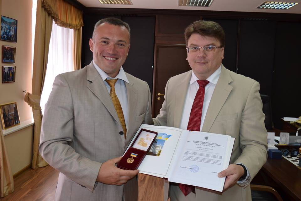 Сергей Тимофеев получает награду от министра молодежи и спорта Игоря Жданова