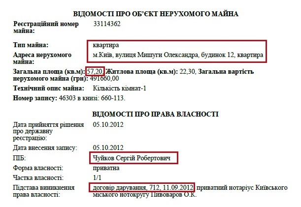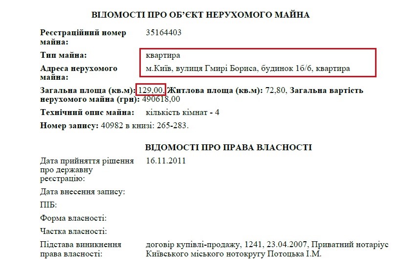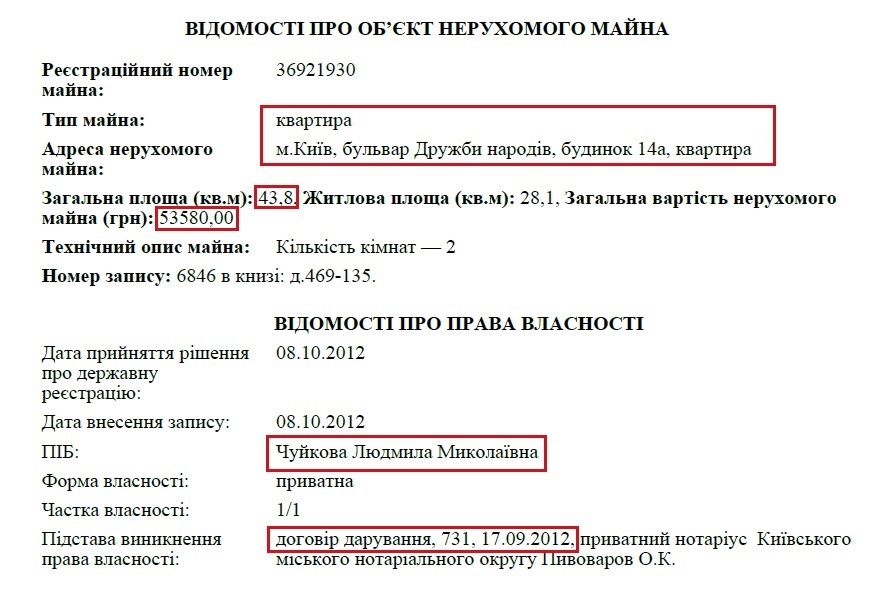 Також матір прокурора володіє квартирою за адресою: бульвар Дружби Народів, 14А. Її пані Людмила отримала на підставі договору дарування у 2012 році. Вартість цієї квартири 53 580 грн. Хоча, зрозуміло, що вартість цієї квартири в цьому районі коштує як мінімум у 10 разів дорожче.