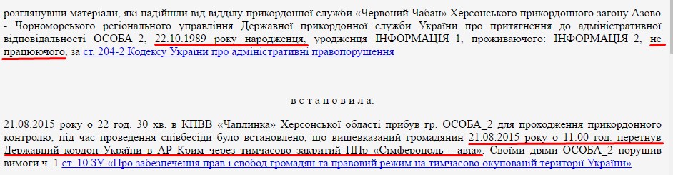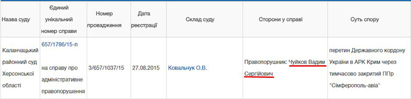 Також у відкритому реєстрі судових рішень ми знайшли цікаву інформацію про те, що громадянин Чуйков Вадим Сергійович був притягнутий до відповідальності за порушення правил перетинання кордону до АРК Крим. Судом встановлено, що він 21.08.2015 року о 11:00 год. перетнув кордон України в АР Крим через тимчасово закритий пункт пропуску «Сімферополь - авіа». Іншими словами, Чуйков В.С. прилетів літаком до Криму (очевидно з Росії) незважаючи на те, що Україною заборонені перельоти до Криму, а перетин кордону має відбуватися у чітко встановлених пунктах пропуску. У постанові суду вказано, що правопорушник є безробітним. Проте повне співпадіння П.І.П. та дати народження порушника та героя нашої статті дозволяє нам стверджувати, що це-таки одна і та ж людина. Якщо це правда, то інформація однозначно має зацікавити генеральну інспекцію ГПУ.