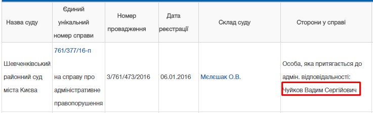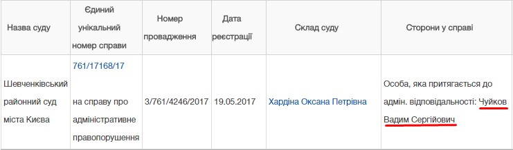 У реєстрі є ще одна справа щодо Чуйкова Вадима і за нашою інформацією йдеться також про керування у стані алкогольного сп’яніння. Останнє засідання було 19.06.17 року. Цікаво чи цього разу йому вдасться уникнути відповідальності.