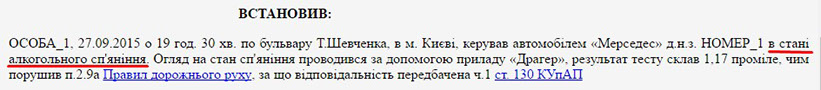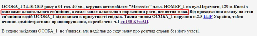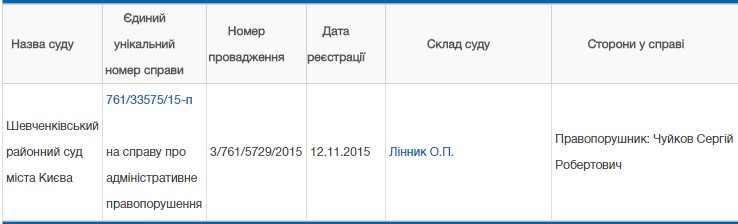 А вже через місяць, у жовтні 2015, п’яним за кермом було задокументовано Чуйкова Сергія Робертовича. Суд визнав його винним, але якщо для інших таке порушення означає великий штраф та позбавлення прав керування, то тут суд обмежився лише штрафом. Чим зумовлене таке лояльне ставлення судді до порушника можемо лише здогадуватись.