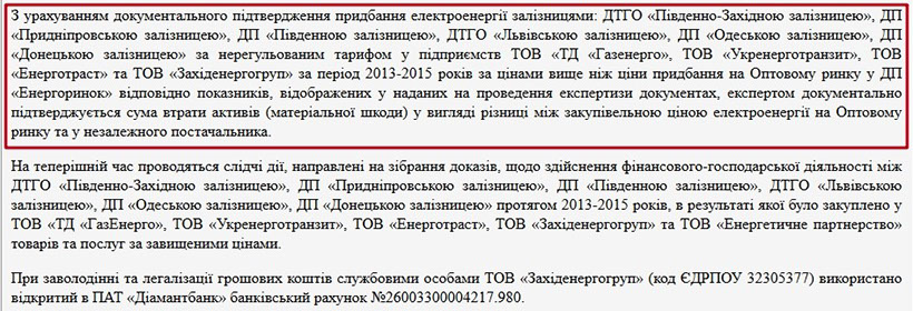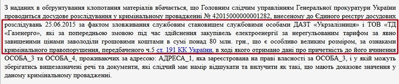 У одному із судових рішень зазначається, що службові особи ДАЗТ «Укрзалізниця» і ТОВ «ТД «Газенерго», заволоділи грошовими коштами в сумі понад 80 млн. грн. під час здійснення закупівель електроенергії за явно завищеними цінами.