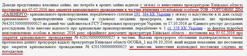 Ці справи розслідуються Головним слідчим управлінням Генеральної прокуратури. Однак виявляється, що прокуратура Київської області, де і працює син бізнесмена, також долучилась до них і у дуже специфічний спосіб. У ході кримінальної справи на рахунки ТОВ «Торговий дім «Газенерго» було накладено арешти. Ці арешти представники «Газенерго» намагались зняти, посилаючись на Постанову про закриття кримінального провадження, винесену саме прокуратурою Київської області. Але у судовому засіданні з’ясовано, що ця постанова є … фальшивою. Виникає логічне  питання - яку роль у цій афері грали батько та син Чуйкові ?