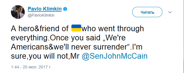 "Герой и друг Украины, преодолевающий любые трудности. Однажды вы сказали: "Мы - американцы и мы никогда не сдадимся". Я уверен, так и будет, мистер Джон Маккейн", - в свою очередь выразил поддержку Климкин.