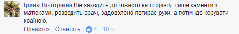 "Он заходит к каждому на страницу, пишет каменты с матом, разводит срач, довольно потирает руки, а потом идет управлять страной", – шутит Ирина Викторовна.