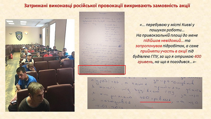 Службою безпеки задокументовано проведення інструктажу учасників та їхнє пересування до місця події. Того ж дня СБУ спільно з поліцією затримали 29 провокаторів. Серед них був і організатор акції, який вже надав свідчення про замовників