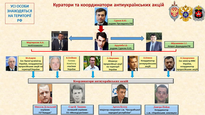Глава СБУ назвав замовником акцій Адміністрацію президента Росії. Одним з кураторів, за словами Грицака, був Сурков. Серед людей, які займалися організацією та фінансовим забезпеченням, глава СБУ назвав колишніх українських високопосадовців Миколу Азарова, Віталія Захарченка, Андрія Клюєва.