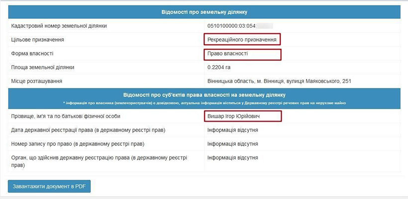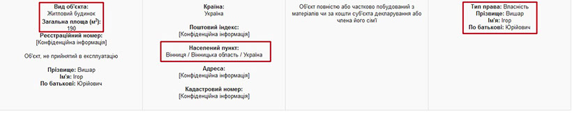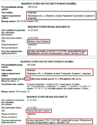 "Площадь помещения Вышар Анны Игоревны нам, к сожалению, не известна, так как это не указано в реестре недвижимости. Зато квартира Вышар Виктории Игоревны размещена по адресу г. Винница, улица Театральная, 2 и имеет площадь 113 кв.м", - добавили активисты.