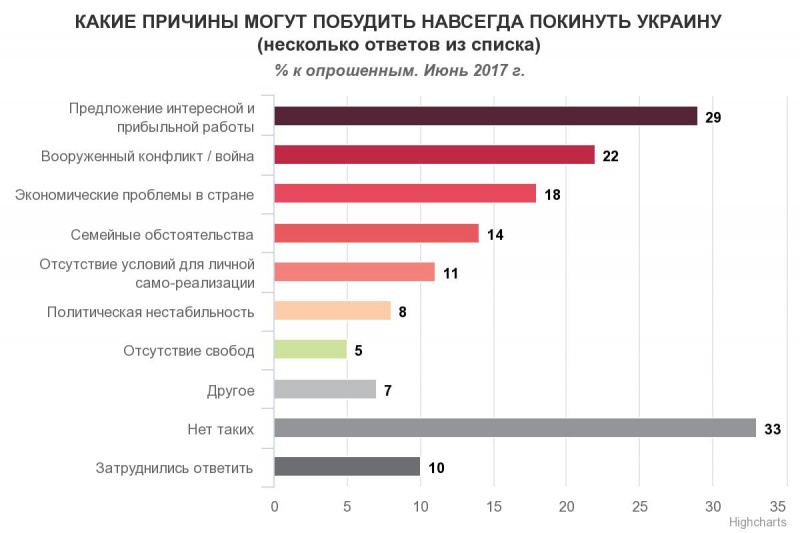 Основными причинами возможной эмиграции жители Украины назвали предложение интересной и прибыльной работы (29%) и вооруженный конфликт (22%). Далее по значимости следуют экономические проблемы в стране (18%) и семейные обстоятельства (14%). Замыкают перечень наиболее упоминаемых причин возможной эмиграции отсутствие условий для самореализации (11%) и политическая нестабильность (8%). Кроме того, треть украинцев (33%) отметили, что никакие обстоятельства не могут их побудить навсегда покинуть страну.