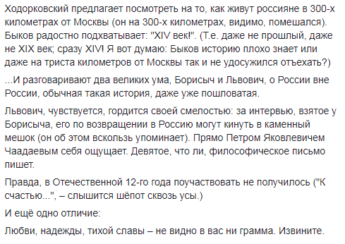 Ходорковский предлагает посмотреть на то, как живут россияне в 300-х километрах от Москвы (он на 300-х километрах, видимо, помешался). Быков радостно подхватывает: "XIV век!". (Т.е. даже не прошлый, даже не XIX век; сразу XIV! Я вот думаю: Быков историю плохо знает или даже на триста километров от Москвы так и не удосужился отъехать?)" - передал Раздельный часть интервью Ходорковского.