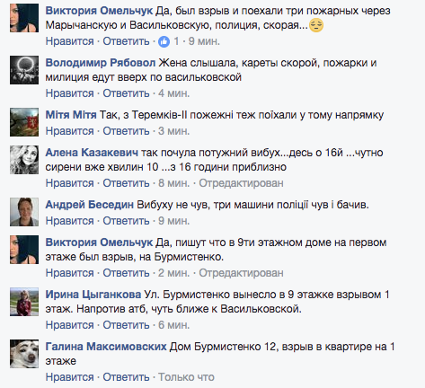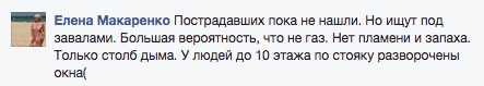 Также сообщается, что пострадавших пока не нашли. "Большая вероятность, что не газ. Нет пламени и запаха. Только столб дыма. У людей до 10 этажа по стояку разворочены окна" ,- пишут пользователи в Facebook.
