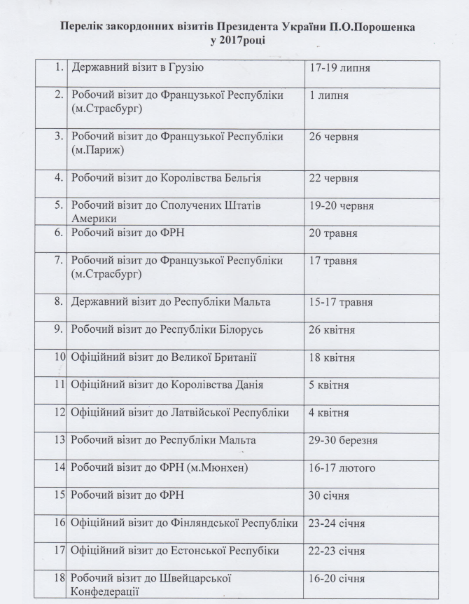 Президент Украины Петр Порошенко по состоянию на 19 июля текущего года успел осуществить 18 поездок в другие государства, некоторые страны президент при этом посетил не единожды. Так, в Германии глава государства побывал трижды (январь, февраль, май), столько раз он посетил Францию (май, июнь, июль), дважды – Мальту (март и май). С полным списком стран, которые посетил в 2017 году президент, можно ознакомиться в ответе АП.