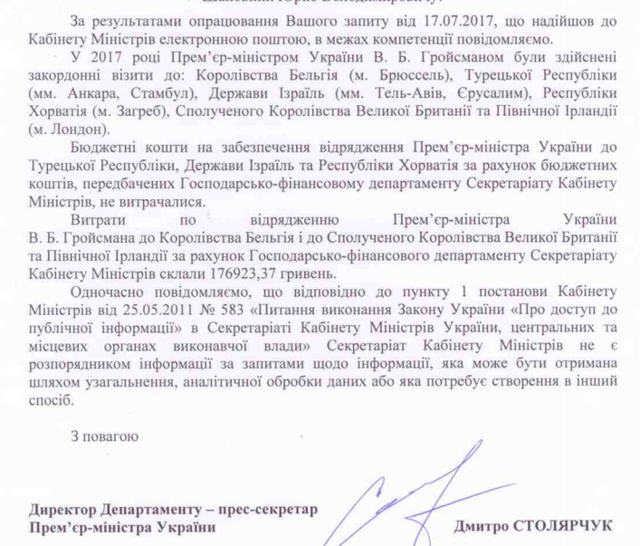 Владимир Гройсман в 2017 году не все свои официальные поездки осуществлял за государственные средства. Согласно официальному ответу Секретариата Кабмина, глава правительства в нынешнем году официально посетил 5 стран. На визиты в Турцию, Хорватию и Израиль бюджетные деньги не выделялись. Поездки Гройсмана в Бельгию и Великобританию стоили бюджету в 176 тыс. 923,37 грн.
