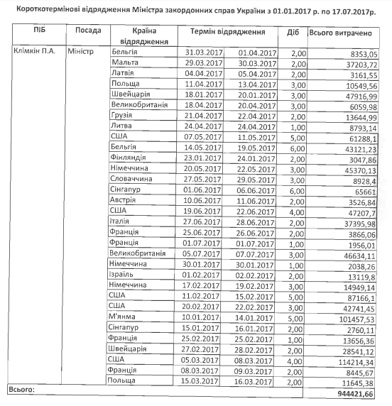 Больше всего стран (что вполне логично) в рамках заграничных визитов в 2017 году посетил глава внешнеполитического ведомства Украины Павел Климкин. В рамках своей деятельности он осуществил 32 визита. При этом география их весьма широка: глава МИД побывал как в соседних с Украиной странах (Польша, Словакия), в Западной Европе (Франция, Италия), так и в неблизких США, Сингапуре, Мьянме и Израиле. С полным списком поездок Климкина можно ознакомиться ниже, а мы же отметим, что поездки министра бюджету обошлись в 944 тыс. 421,66 грн. Отметим, что самыми дорогостоящими оказались визиты Климкина в США и Мьянму (свыше 100 тыс. грн каждая), а также в Швейцарию, Германию, Великобританию и Бельгию.