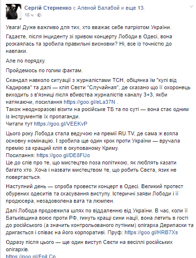 "В этом году Лобода стала ведущей на премии RU.TV, где сама же взяла основную номинацию. И сделала еще один шаг против Украины — вручала премию за лучший клип в оккупированном Крыму. Далее Лобода продолжила путь по отдалению от Украины. В то время, когда ее Родина воюет против РФ, гибнут лучшие сыны нации, она летит в гости к русскому (а значит контролируемого Путиным) олигарху Дерипаске и дрыгается и поет на его корпоративе. Сразу после этого — еще одно выступление Светы на свадьбе российских олигархов. Как говорится, пошла по траектории наклона. Деньги же не пахнут, а потому можно побыть игрушкой для убийц", - написал Стерненко.