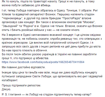И добавил: "На 3 сентября в Одессе запланирован указанный концерт. И это вполне сознательная провокация и, не побоюсь сказать, попытка реванша тех, кто сотрудничает со страной агрессором. Это вызов всей патриотической общественности Одессы, и я приглашаю всех своих друзей из других регионов на этот день прибыть в город. Потому что нам просто плюют в лицо".
