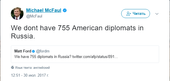 В другом твите Макфол заявил, что вообще озвученного Москвой количества американских дипломатов в России нет. Путин говорил, что 755 дипломатов покинут Россию, но Макфол говорит, что столько вообще нет.