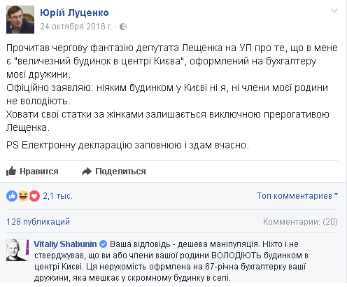 24 октября, через неделю после этой продажи, Юрий Луценко заявил, что его семья не имеет отношения к этому дому. "Официально заявляю: никаким домом в Киеве ни я, ни члены моей семьи не владеют. Электронную декларацию заполняю и сдам вовремя", - написал он в Facebook: