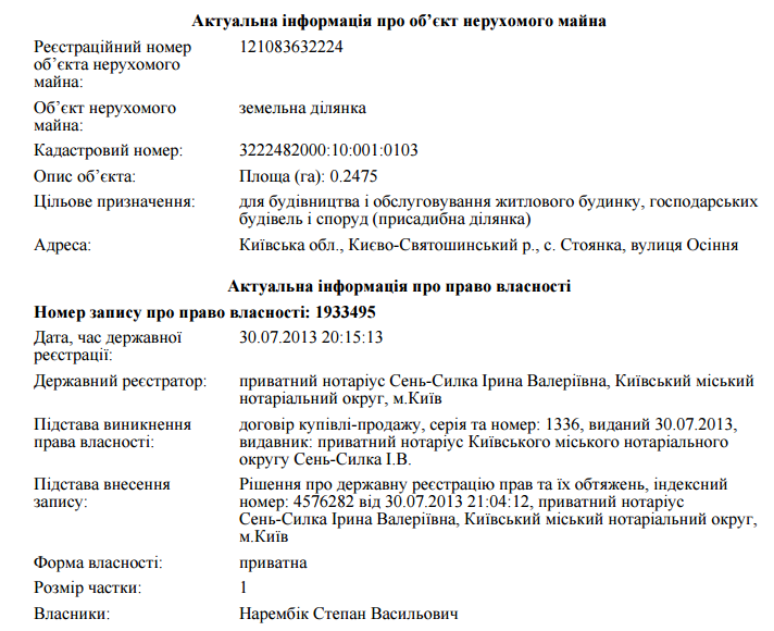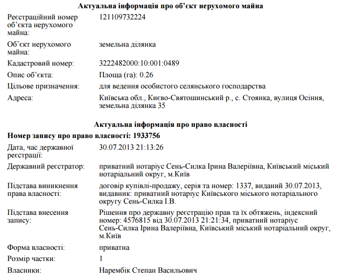 Отметим, что согласно данным реестра недвижимости, соседний участок площадью в 26 соток (на карте он слева, в виде перевернутой буквы "Г") также принадлежит Степану Нарембику. Наверняка супруги Луценко пользуются и этим участком, однако в своих декларациях они его ни разу не указывали: