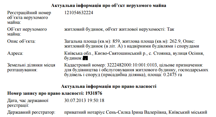 Однако живет семья генпрокурора в большом доме площадью 859 кв. м. в селе Стоянка под Киевом, недалеко от житомирской трассы. Там есть еще 80-метровый гараж. Усадьба расположена на участке площадью почти 25 соток. Все эти объекты, согласно данным реестра недвижимости, записаны на тестя генпрокурора Степана Нарембика: