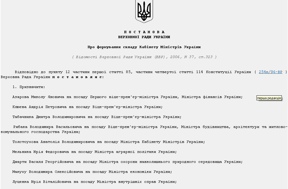 Однако спустя две недели Рада утвердила состав нового правительства во главе с лидером Партии регионов. Луценко вошел в кабинет Виктора Януковича в прежней должности – снова как глава МВД. Его коллегами, среди прочих, стали регионалы Николай Азаров, Андрей Клюев, Дмитрий Табачник, Василий Джарты и Юрий Бойко, а также "оранжевые" Роман Зварич и Анатолий Гриценко: