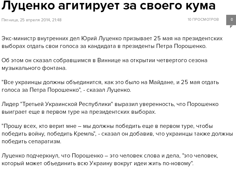 "Все украинцы должны объединиться, как это было на Майдане, и 25 мая отдать голоса за Петра Порошенко. Это человек слова и дела, это человек, который может объединить всю Украину вокруг идеи жить по-новому", - заявлял Луценко: