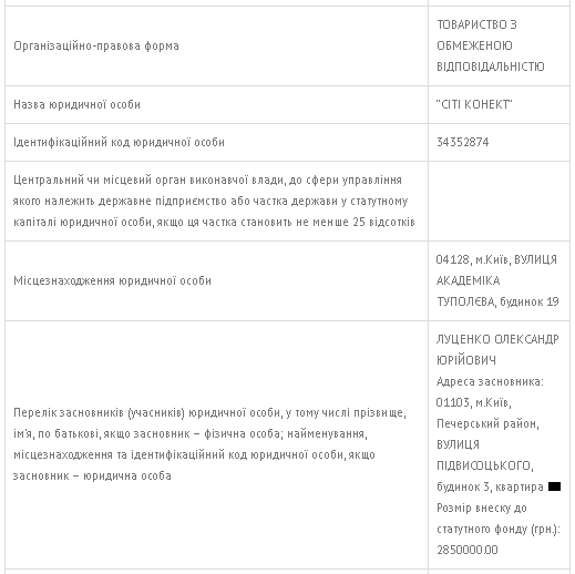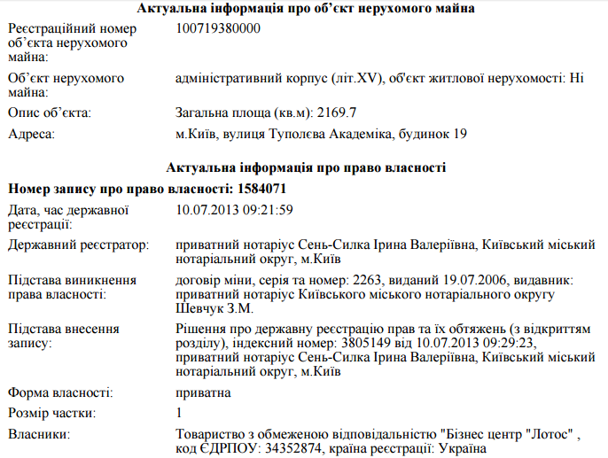 На сына Луценко Александра записано ООО "Бизнес-центр "Лотос". Он расположен в Киеве на ул.Туполева, 19. Согласно данным реестра недвижимости, офисное здание площадью 2 170 "квадратов" было приобретено в июле 2006 года, то есть когда Юрий Луценко возглавлял МВД: