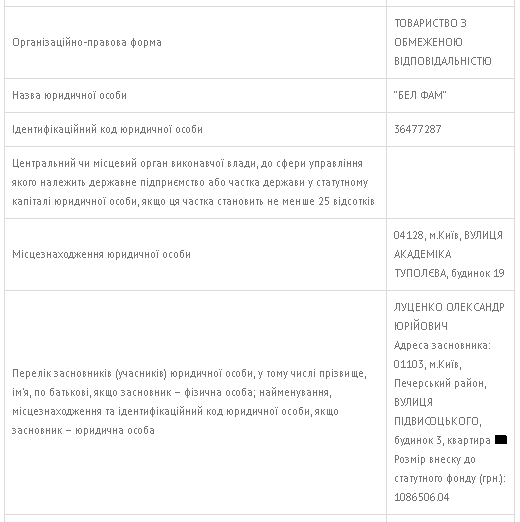 Еще один бизнес, который записан на сына генпрокурора – салон красоты в центре столицы, на ул. Олеся Гончара, 67. Помещение там принадлежит Ирине Луценко, она его сдает в аренду ООО "Бел Фам", учредитель которого Александр Луценко: