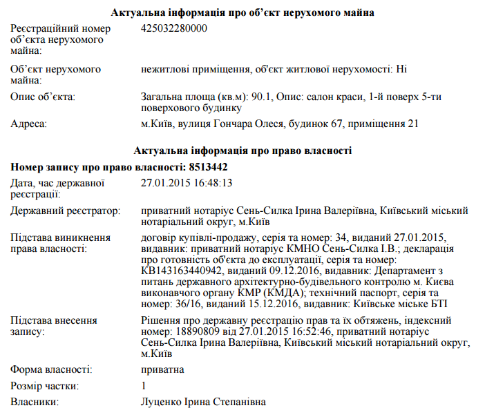 Интересно, что оба супруга Луценко ошиблись в своих декларациях, когда указывали данные об этом помещении. Они задекларировали, что Ирине Луценко принадлежит квартира площадью 92,2 кв. м. стоимостью 4,452 млн. гривен: